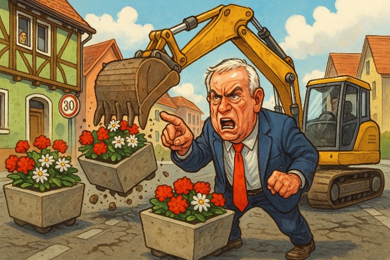 Er erkannte in diesen Kübeln offenbar eine Invasion der kommunalen Deko-Diktatur.